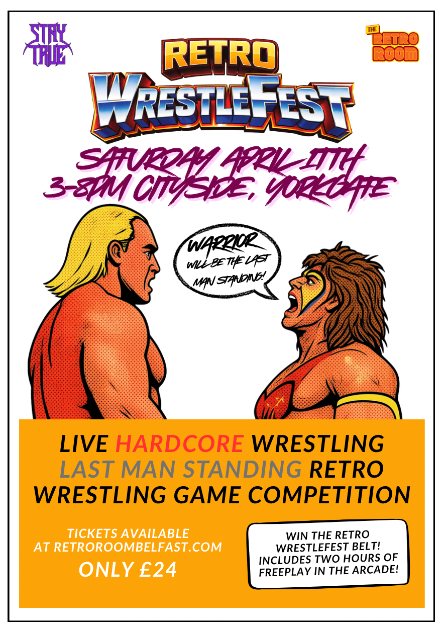 What’s Retro WrestleFest y’say? Well it’s live hardcore wrestling from the wrestlemaniacs at Stay True from 3-6pm followed by the first Last Man Standing wrestling game competition across multiple consoles, franchises and titles from 6-8pm on Saturday April 11th. The Last Man Standing will win the Retro WrestleFest championship belt!