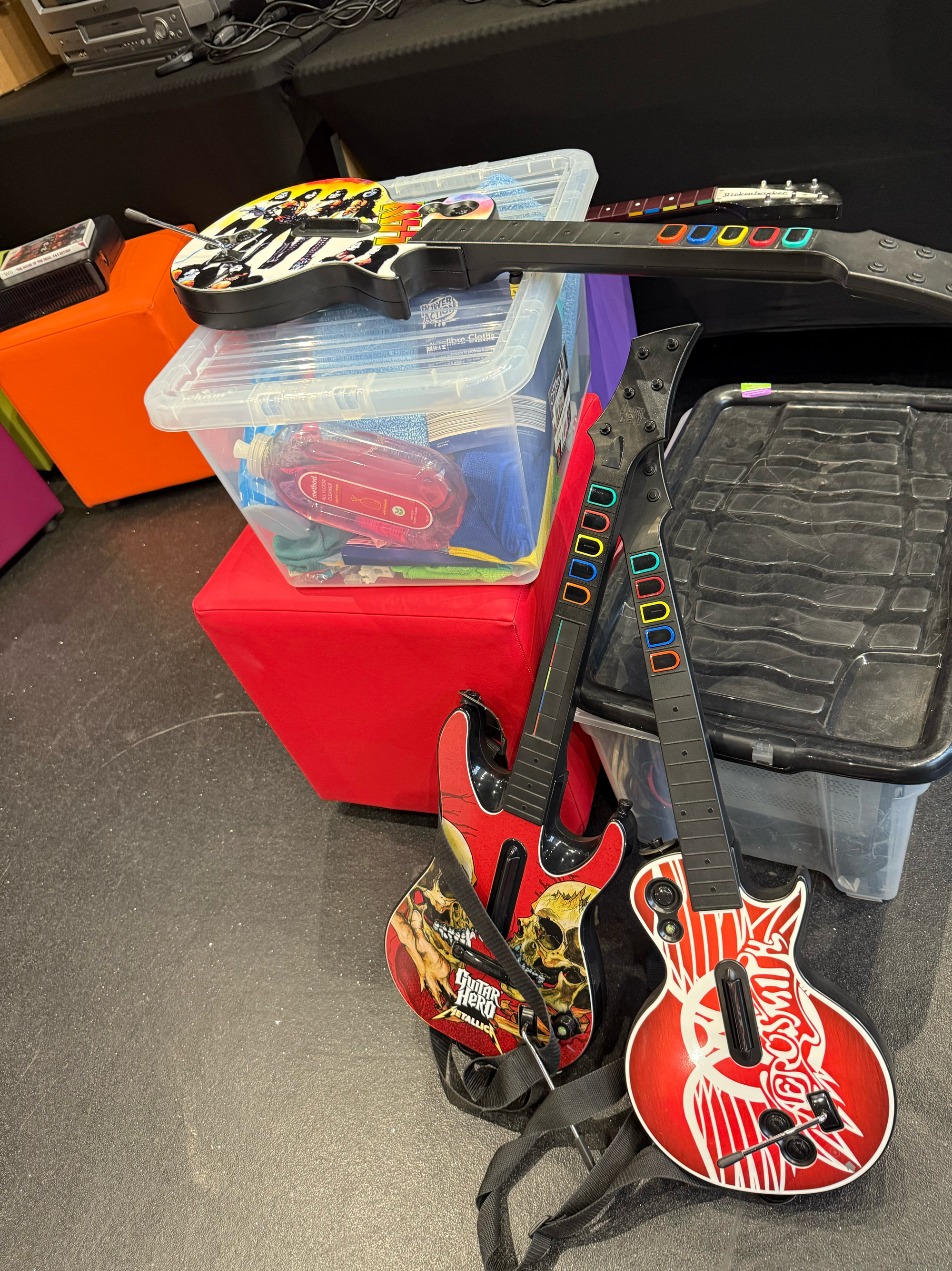 And we're bringing back the Gigantic Guitar Hero setup too for all you rock and metal heads out there. We'll have Guitar Hero 3: Legends of Rock, Warriors of Rock and if you want to go more 60s that 80s Beatles Rock Band is possible too. All of the songs are fully loaded up . Time to get shredding!